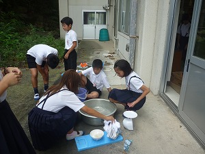 男女も協力しながら、汚れに合わせて、「もみ洗い」「つまみ洗い」などに挑戦しました。