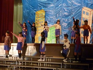 2年生は、初めての劇に挑戦しました。たくさんの観客の方を前にとっても緊張し、すこし固い表情でのスタ-トでしたが、持ち前の元気のよさを出し切ることができました。途中、歌の伴奏が聞こえない程大きな声で歌え、劇の最後ではめでたくのらねこ天国を建国できました。かがやきフェスティバルという大きな行事に向けて頑張ることができ、自分の台詞を大きな声で言ったり、みんなで歌ったりすることを通して、また一つ成長した姿を見せることができました。